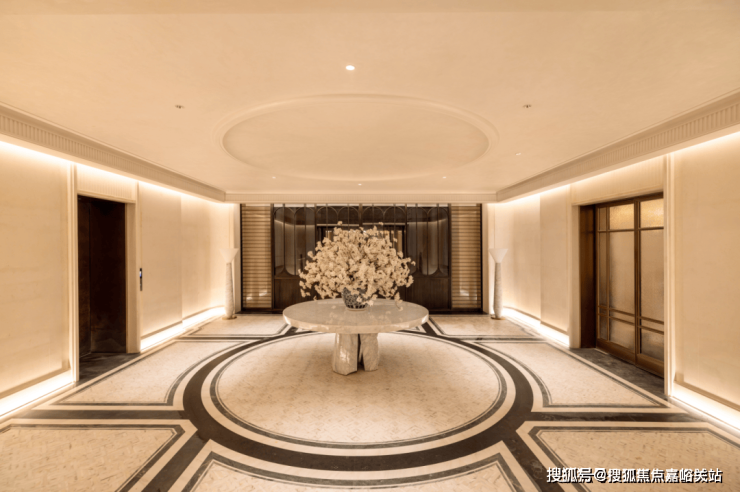 在门庭的环岛空间,景墙面采用中轴对称的设计布局,定制了奢石镶嵌装饰,将曲面艺术与经典石器之美圆融交融。