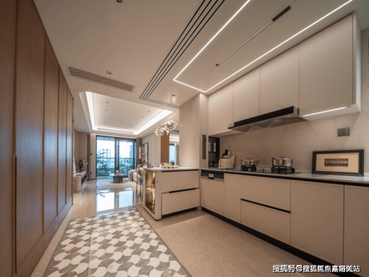 其一,半开放式厨房,结合客餐厅阳台一体化设计,当你站在厨房,视线无遮挡直接触达阳台,甚至直抵外面景观。