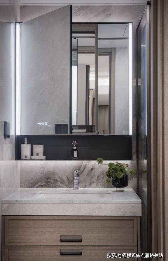 背后主墙面采用岩板设计,经久耐用,内部还收纳细节还预留4孔电源,电动牙刷、卷发棒等吹风机收纳孔、洗脸巾抽取孔。