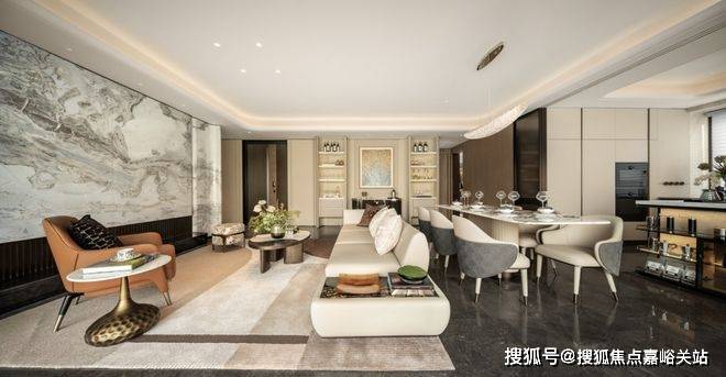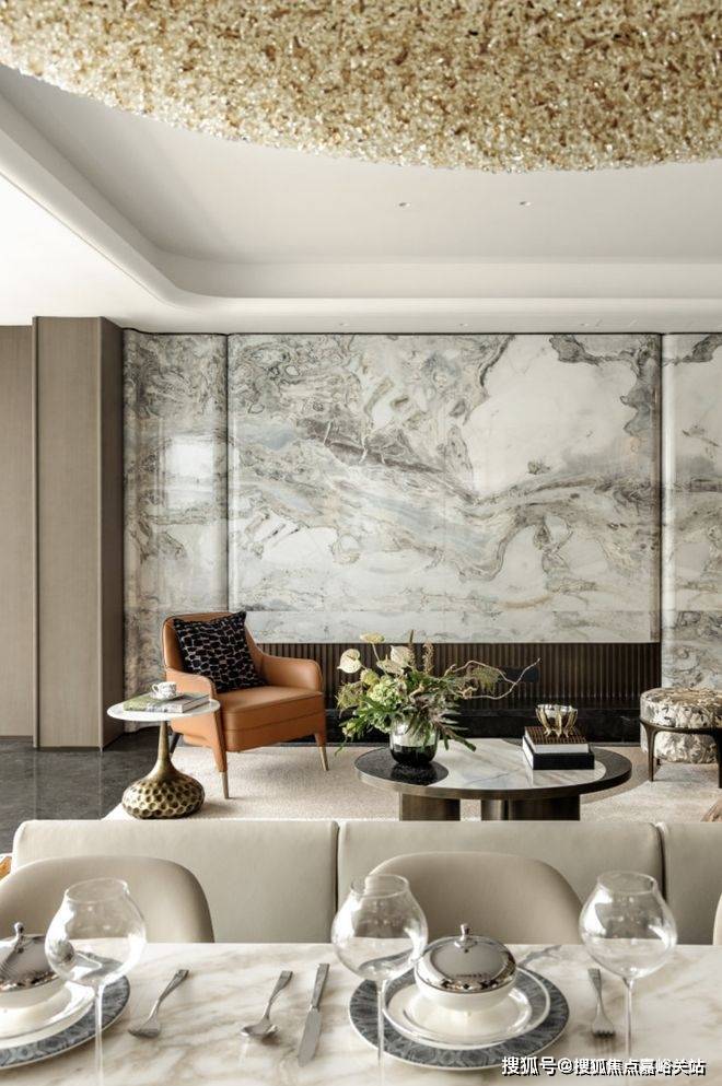 室内美学追求“奢而不露,雅韵自生”永恒感。客厅背景墙选用珍稀的芬迪蓝奢石,不惜成本做了立体弧面造型处理,并镶嵌不锈钢材质,这样复杂的工艺不仅成本巨大,业主自己也很难做到。