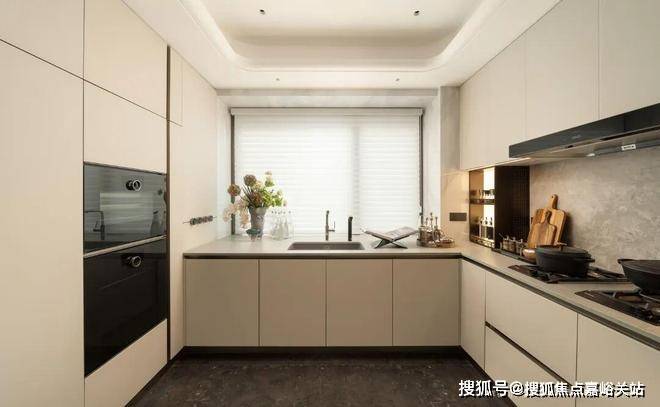 玄关柜采用枫影木,内置鞋柜精灵,还在过道做了整排收纳柜;厨房地柜、上柜、抽屉分格系统同样科学合理,全屋储物量非常惊人。
