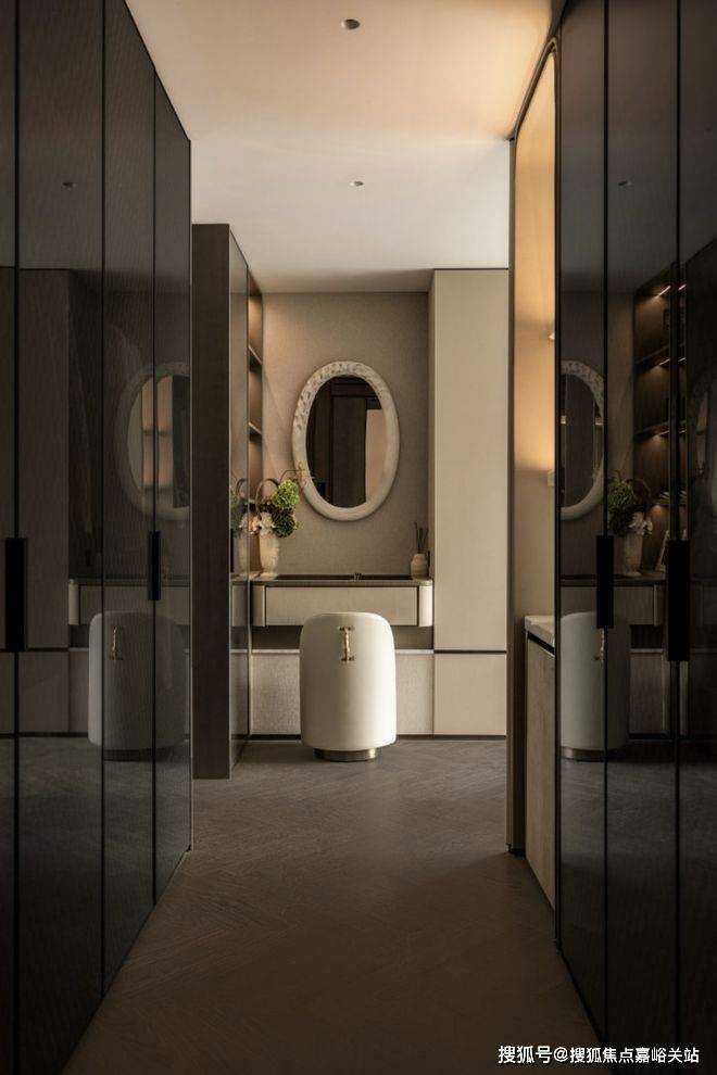 主卧衣柜、梳妆台都做成交付标准,9扇门的超大步入式衣帽间采用昂贵的玻璃柜门,设计首饰格、领带抽乃至珠宝指纹保险柜,这样高端的主卧衣柜交付在全上海豪宅中难得一见。