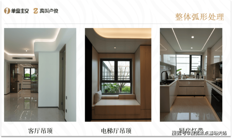 前面提到的延伸室内和阳台的弧形吊顶如此,每个卧室的吊顶如此,甚至是厨房的灯带设计也在做相同的圆弧处理