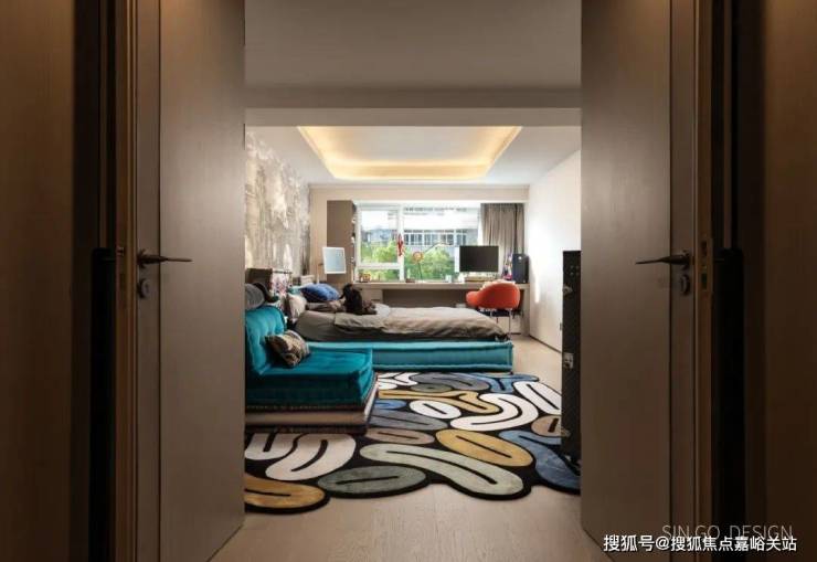 步入卧室,多巴胺风格的大胆用色、充满活力的抽象图案地毯,带来强烈视觉冲击与度假般的欢快氛围。