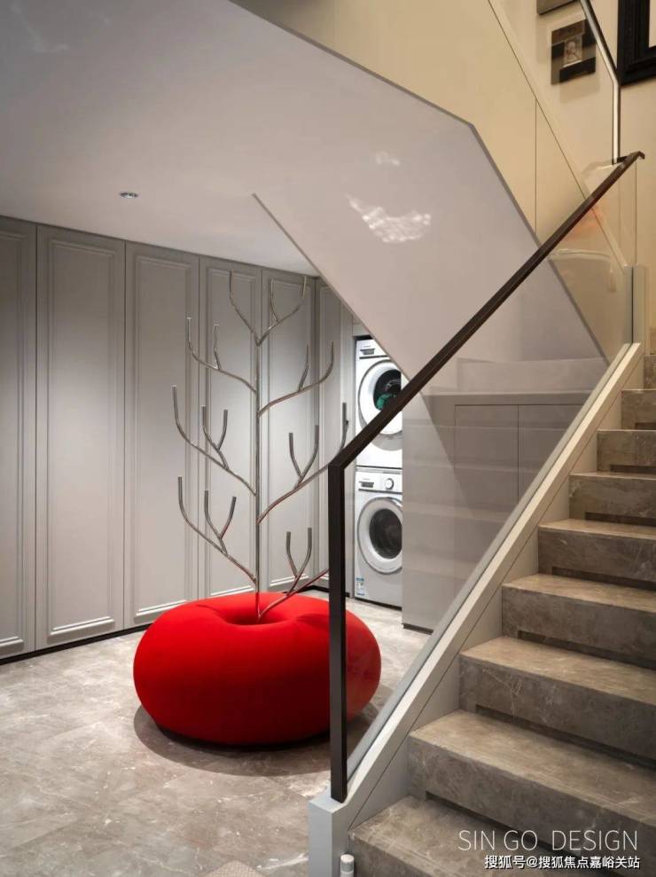设计师特别提到:“苹果凳这个装置,既可以作为换鞋凳,也是让空间出彩的时尚单品——花柱、摆件挂架,兼具不同的使用场景。”