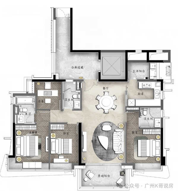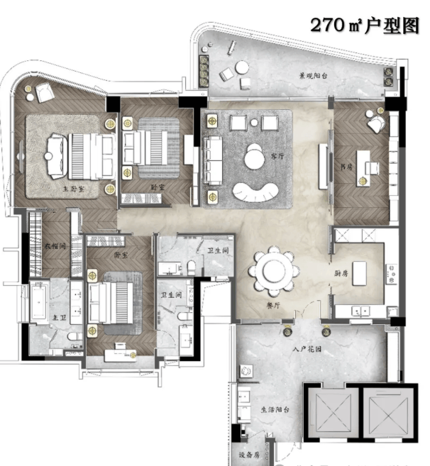 A户型:270㎡环幕江景四房,拥有约9米超大邮轮式阳台,一线望江无遮挡。