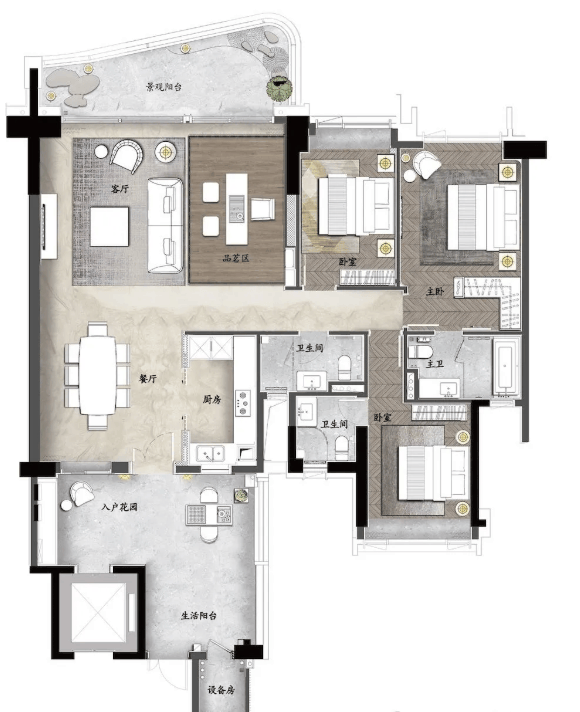 C户型:约140㎡南向园景大宅,三卧室朝南设计,享有两千万豪宅交标配置。