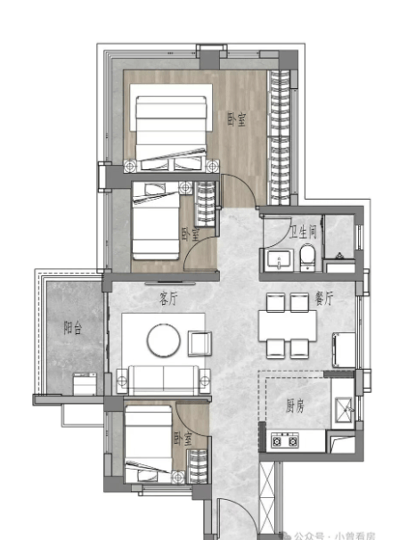 69㎡三房一卫:得房率突破100%,空间利用率极高。主卧配置三面飘窗,采光视野俱佳,总价门槛友好,特别适合预算有限的年轻夫妻或三口之家。