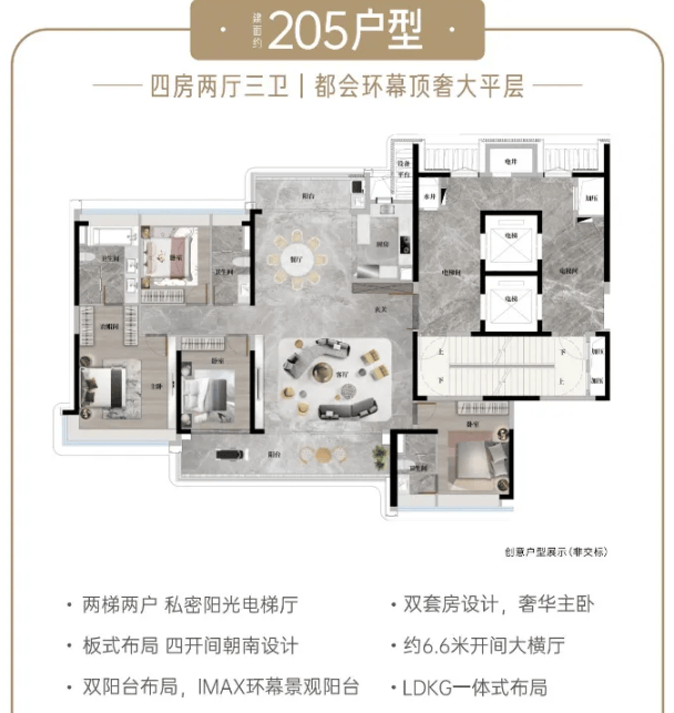 建面约205㎡奢适四房:中轴园林上,环幕景观楼王。