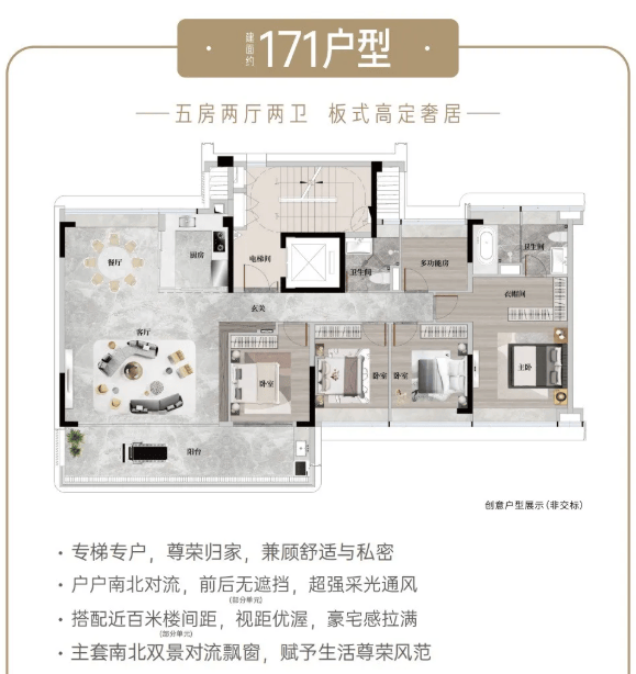 建面约171㎡奢适五房:享长隆头排景观,专梯入户。