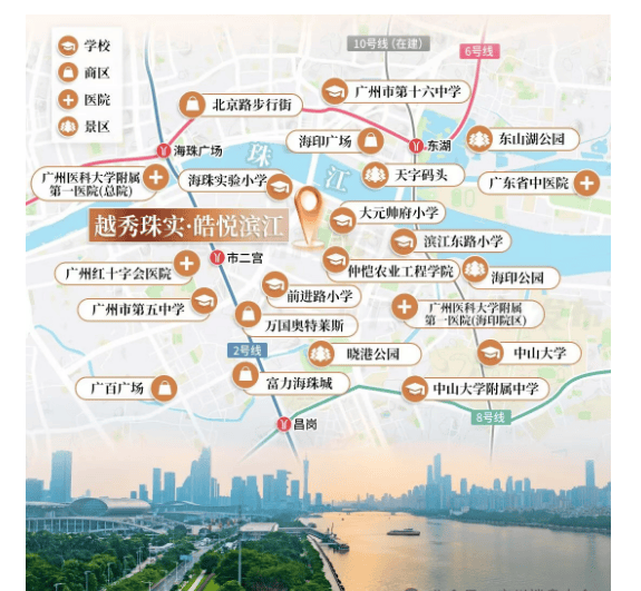 越秀珠实皓悦滨江周边的生活设施齐全,距离万国奥特莱斯、富基广场、海印广场等商业中心仅约1公里,周末购物休闲十分便利。同时,项目靠近滨江中路沿江区域,居民可以轻松享受珠江美景,周边还有海印公园、海珠体育中心等多个休闲场所。
