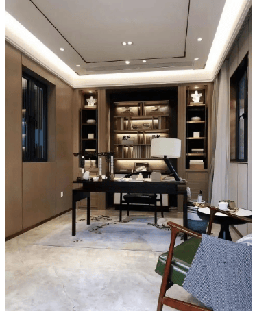 双拼别墅户型,产权面积313㎡,为6房3厅5卫设计,独门独院布局,彰显尊贵身份。首层采用7.5米挑高中空客厅,搭配中式屏风与落地窗,将庭院景观引入室内,打造出“院在景中、景在屋内”的居住体验;首层还规划有父母房,临近庭院与卫生间,方便老人日常起居。