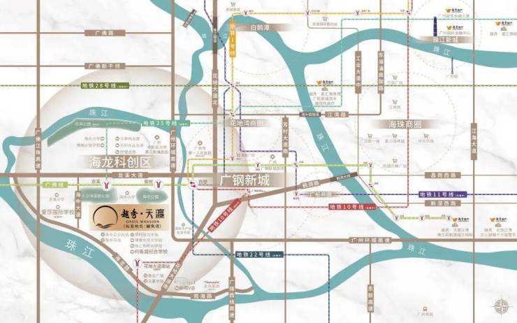 交通路网:双线地铁接驳(1号线、11号线在建)。海龙路提速在即,环城高速近在咫尺,快速串联广钢新城、珠江新城。