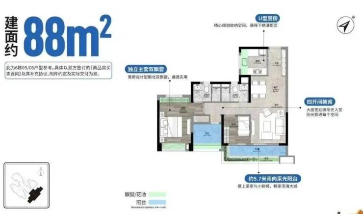 88㎡三房两卫:阳台连接次卧,拥有5.7米南向景观阳台,东南向可欣赏到美丽的海景。