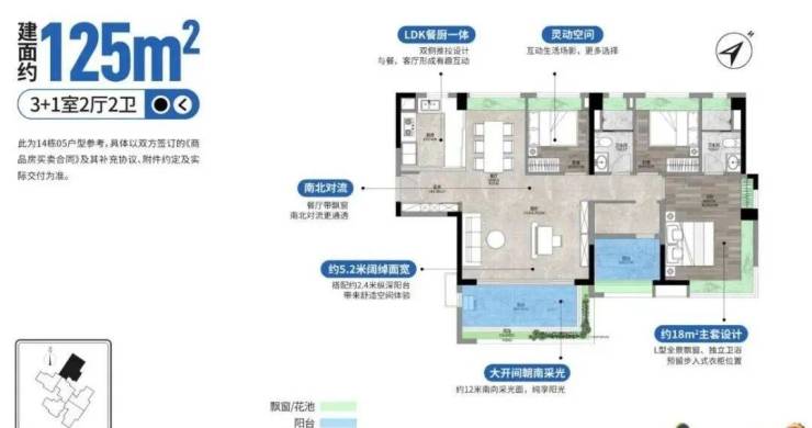 125㎡四房两卫:豪华四房设计,主卧室配备L型全景飘窗,12米南向采光,适合大家庭居住。