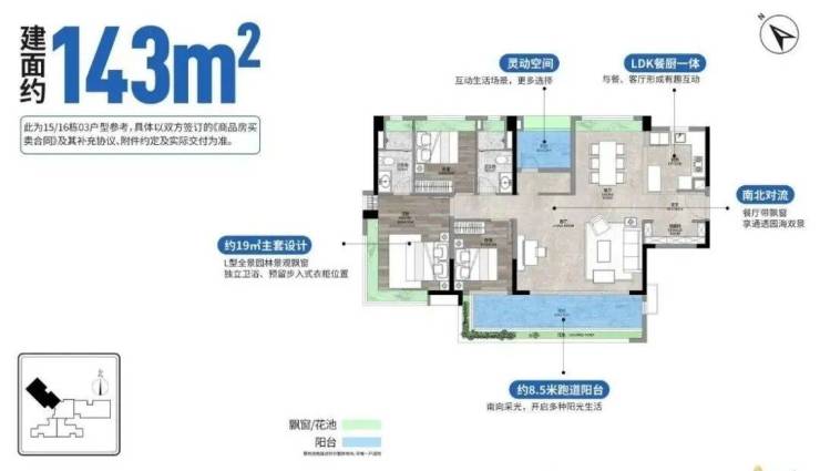 143㎡四房两卫:南北对流设计,约8.5米长阳台,西南西望园林,北向可观赏海景,主卧室设有270度全景飘窗。
