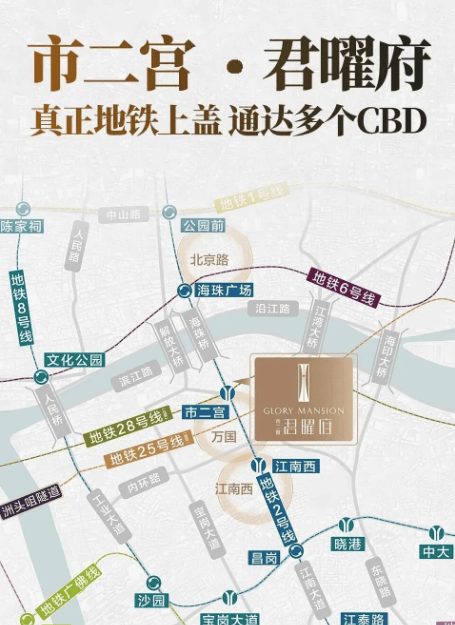 君曜府紧邻地铁2号线和规划中的28号线(广佛段在建中)交汇点——市二宫站,出行极为便捷。通过2号线可以快速到达北京路、万国、江南西等商圈,通达珠江新城和琶洲等核心商务区。此外,项目周边还有多条主干道如江南大道、内环路和滨江路,方便驾车出行。家门口的市二宫公交站有超过20条日夜班线路,进一步提升了出行的便利性。