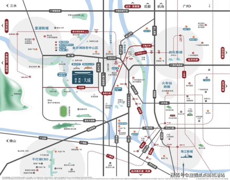 项目地处广佛同城核心桥头堡——金沙洲中芯板块,构建“1电车、2地铁、3高速、4大桥”的多维交通网络。社区内设超2,000㎡公交枢纽,步行约1.5公里可达里水有轨电车梅冲站;未来可便捷接驳广州地铁12号线(里横路站,预计2027年通车)、佛山地铁8号线(岗美站),并快速接入广州环城高速、沈海高速及广佛珠江高速。四大跨江通道——已通车的金沙洲大桥、在建的广佛大桥,以及规划中的沉香大桥、碧江大桥,全面打通至白云、荔湾、千灯湖及珠江新城的通勤动脉,实现约30分钟广佛双城生活圈。