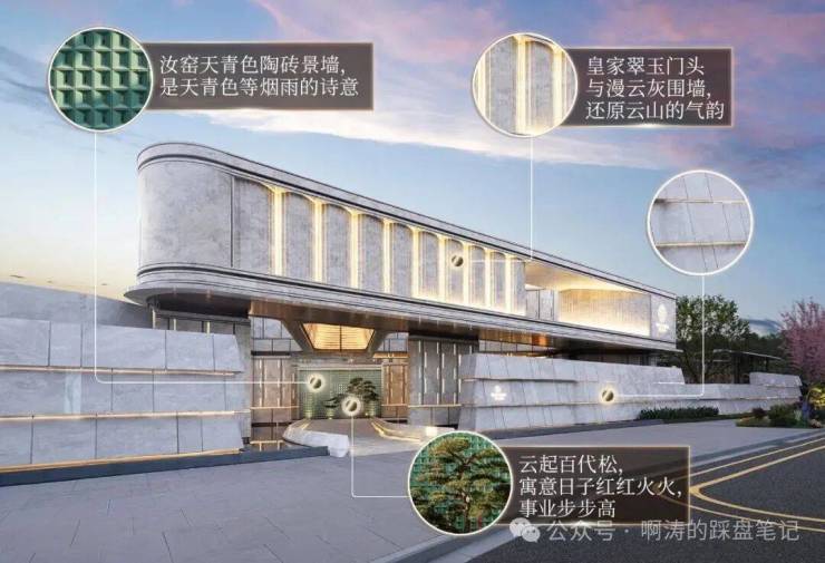 入口门头:皇家翠玉门头搭配漫云灰石材,还原白云山层峦叠嶂的意境;主入口处设置云起百代松与汝窑天青色陶砖景墙,寓意吉祥、诗意满满。