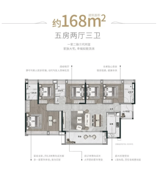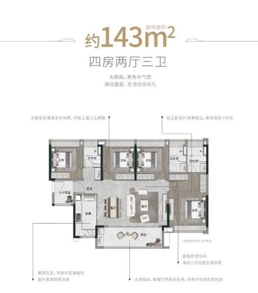 143-168㎡四至五房户型:为高端改善户型,两梯四户设计,私密性更强。户型空间开阔,客厅面宽充足,部分户型配备超大观景阳台,可俯瞰双湖生态景观与社区园林。主卧采用套房设计,配备独立卫浴、衣帽间,彰显尊贵品质,多间次卧可灵活改造为书房、儿童房、老人房,满足多元化居住需求,适合追求高品质生活的高端改善家庭。