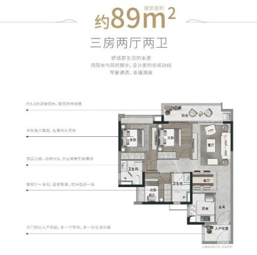 89㎡三房户型:作为刚需主力户型,设计紧凑实用,空间利用率高。该户型配备5.8米阔景阳台,采光通风效果极佳,可俯瞰社区园林景观。客厅与餐厅相连,打造开阔的活动空间,三间卧室布局合理,满足一家三口的居住需求,主卧带飘窗设计,提升居住舒适度,适合年轻刚需家庭。