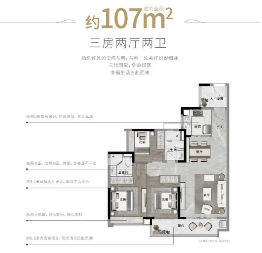 107-109㎡三房户型:在89㎡户型的基础上,空间更加宽敞,客厅面宽更大,活动区域更充足。卧室尺寸优化升级,储物空间更丰富,能满足家庭人口较多的刚需家庭或追求舒适居住体验的购房者。部分户型采用南北通透设计,通风采光俱佳,居住体验感大幅提升。