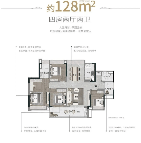 128㎡四房户型:主打改善型需求,南北对流设计是其核心亮点,保证室内空气流通,四季舒适。户型布局方正,动静分区明确,客厅、餐厅与阳台相连,视野开阔,四间卧室可满足多孩家庭或三代同堂的居住需求,部分卧室带独立卫浴,提升居住私密性,适合重视家庭生活的改善型购房者。