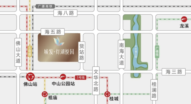 轨道交通更是亮点,项目毗邻地铁 3 号线和 5 号线,距离地铁 3 号线中山公园站约 700 米,步行就能到达。3 号线通车后,3 站就能到桂城,8 站直达广州荔湾,不管是去千灯湖上班,还是去广州逛街,都非常方便。
