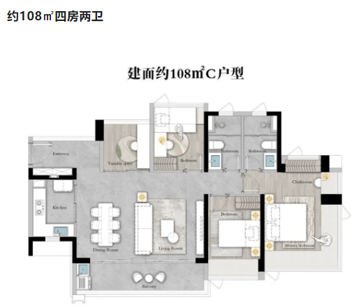 约108㎡四房两卫:豪华的四房设计,不仅空间宽裕,而且配备了高质量的装修标准,带来尊贵的居住体验。