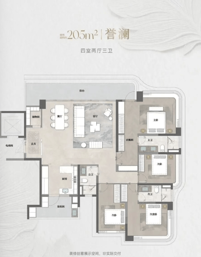 在“誉府系”的营造哲学中,产品本身必须是堪与地脉匹配的艺术品。能建·天誉府作为“新规”时代的标杆之作,在严苛的规范下,依然实现了建面约133-228㎡ 户型约100%-102% 的高使用率,并以此为基础,展开了对“宽幕平层”的极致探索。项目大量采用板楼或类板楼设计,最大化南向面宽与景观视野。以约219㎡ 的户型为例,其拥有约16米的L型全景阳台,实现270° 环幕观江,将江景的收纳推向极致。