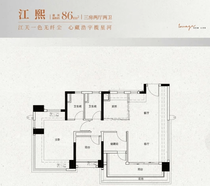 建面约86㎡:三房两厅两卫,南向观景大阳台,全屋动静分离,主卧带270°飘窗。