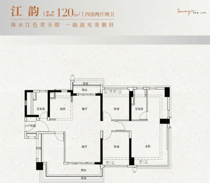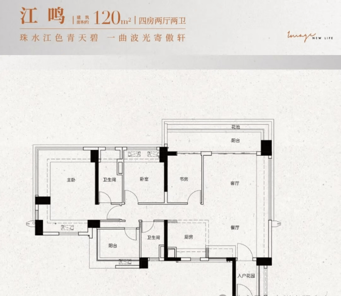 建面约120㎡:四房两厅两卫,四开间朝南,居住与生活动静分离,南向大阳台或南北双阳台,主卧带270°飘窗。