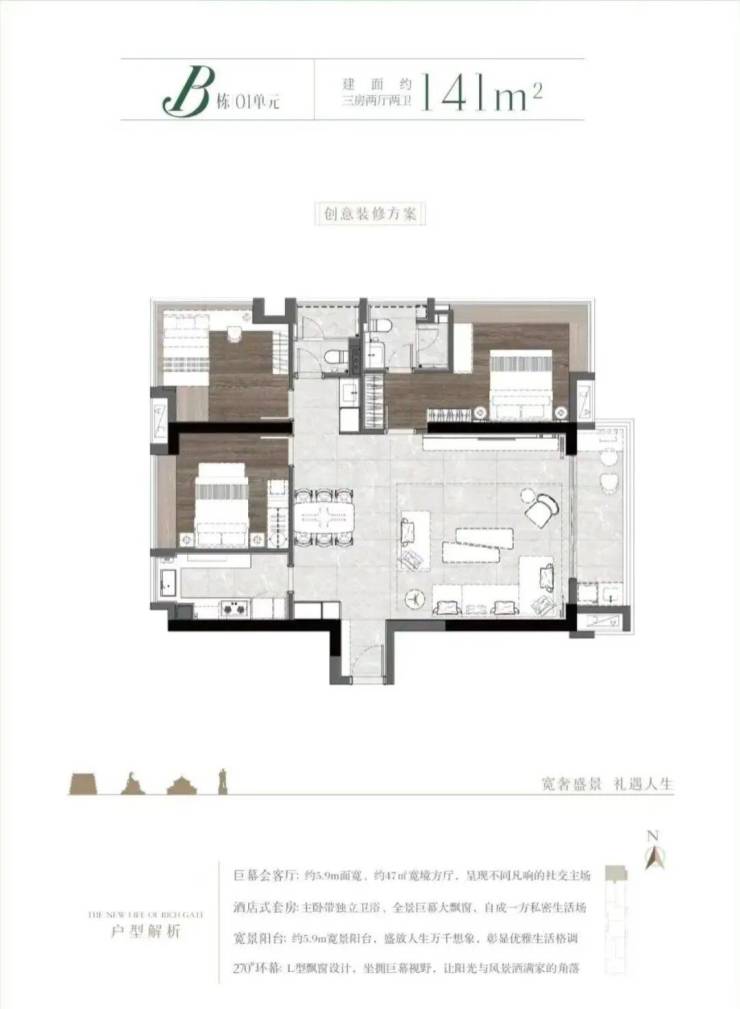 B栋01单元大方厅5.83米开间141㎡三房户型: