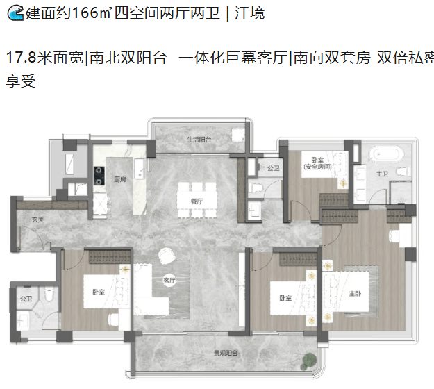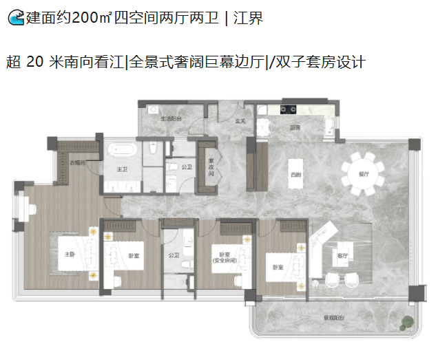 除了100平方米的爆款户型,项目还提供了建面约125平方米、166平方米以及200平方米等多种改善型选择。125平方米户型做到了南北通透,独立入户玄关增加了归家的仪式感,步入式套房设计则为主人提供了极致的私密享受。166平方米户型拥有约17.8米的惊人面宽,南北双阳台与一体化巨幕客厅相连,营造出豪宅般的阔绰气场;南向双套房的设计,更是满足了多代人对私密空间的高标准要求。而200平方米的楼王户型,南向看江面宽超过20米,全景式奢阔边厅与双子套房设计,将奢华演绎到了极致,专为塔尖圈层量身定制。