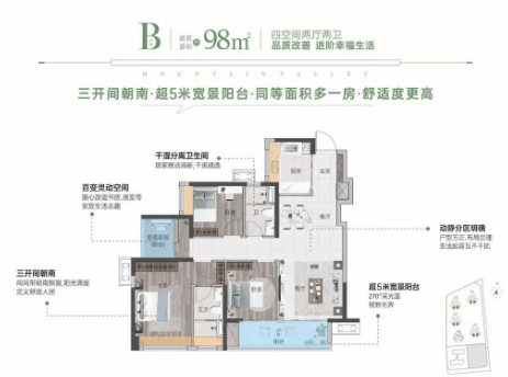 目前在售户型包括85平方米三房两厅两卫、98平方米四房两厅两卫及103平方米四房两厅两卫。这些户型设计注重实用性与舒适性的结合,例如85平方米户型拥有约5米宽大阳台,视野开阔;98平方米户型则以超5米宽阳台和超高赠送率成为精英阶层的理想之选。