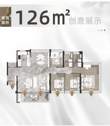 一百零九平方米的四房两卫户型在空间尺度和功能性上更进一步。这个户型采用了经典的南北对流设计,通风采光效果极佳。四个房间中有四个半开间朝南,双面宽大阳台贯穿客厅和次卧,极大地拓展了室内外的互动空间。客餐厅的尺度阔绰,可以轻松容纳大型餐桌和沙发组合,满足大家庭的聚会需求。两个次卧都非常大,同样能做到三边下床,包容性极强,无论是作为儿童房还是老人房都非常合适。玄关处的“八百库”设计再次出现,增强了收纳能力,让入户区域始终保持整洁。这个户型的改造能力也很强,如果家庭人口较少,可以将其中一个次卧与客厅打通,改造成一个超大的横厅,提升空间的通透感和豪华感。一百二十六平方米的五房两卫户型则是项目的楼王产品,专为追求极致舒适的多代同堂家庭设计。五点五开间朝南,四间卧室全部朝南,这种配置在市场上极为罕见。想象一下,清晨醒来,阳光透过窗户洒在床上,温暖而明亮,这是多么美好的生活场景。南北对流的设计让空气时刻流通,保持室内空气清新。双面宽大阳台让景观视野最大化,无论是俯瞰小区园林,还是远眺城市天际线,都能尽收眼底。客餐厅尺度宏大,彰显出主人的尊贵身份。同样配备的“八百库”玄关,让收纳变得轻而易举。这个户型不仅在面积上占据了优势,更在细节设计上做到了极致,每一个空间都经过精心打磨,力求完美。无论是动静分区,还是洁污分离,都考虑得十分周全,为业主提供了一个无可挑剔的居住空间。