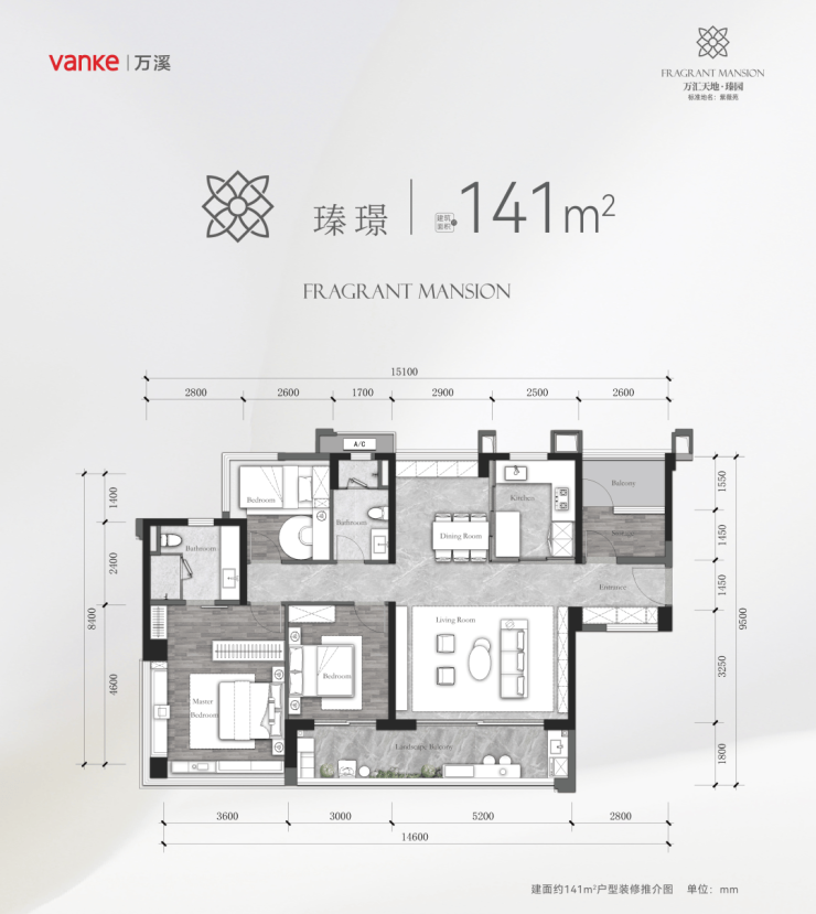 建面约141㎡户型:3房+2厅2卫+灵动空间,全明多开间朝南,约14.6米IMAX采光视野,约8.2米景观大阳台,主卧端厅设计,270°全景采光。