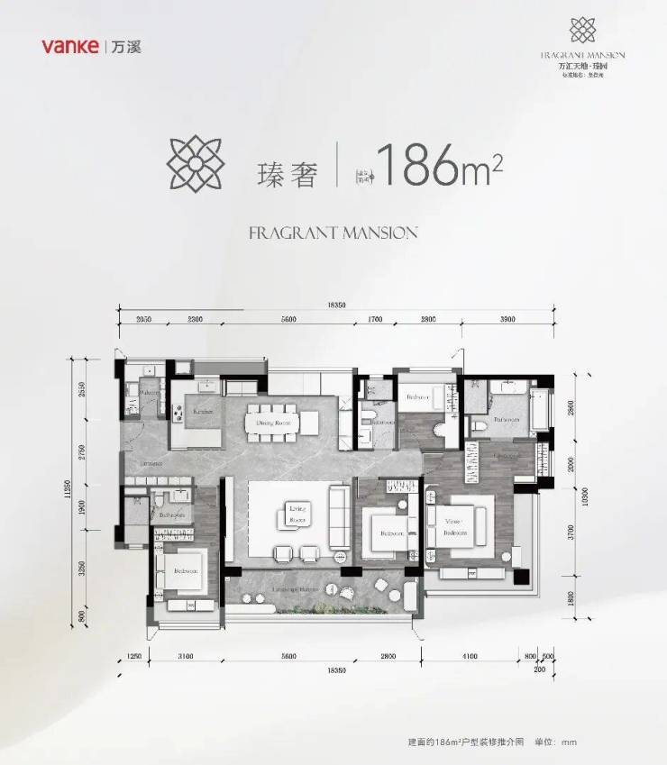 建面约186㎡户型:4房+2厅3卫+灵动空间,正南向一线花地湾河涌景观视野,全明四开间朝南,约18.3米极致奢幕视野,LDKB洄游路线,多功能巨幕宽厅,多功能岛台,端厅套房主卧。