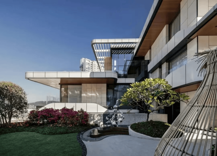 新天半山(南湖山庄)力邀上海世博会、广州西塔设计师倪阳担纲整体规划设计,E 区 “新天・山顶道” 别墅组团采用 “游艇式” 建筑造型,以海浪式自由灵动的曲线语言呼应自然山水之态,在林海中形成独特的视觉焦点。建筑外立面采用干挂石材工艺,不仅质感厚重,更能抵御风雨侵蚀,历久弥新。
