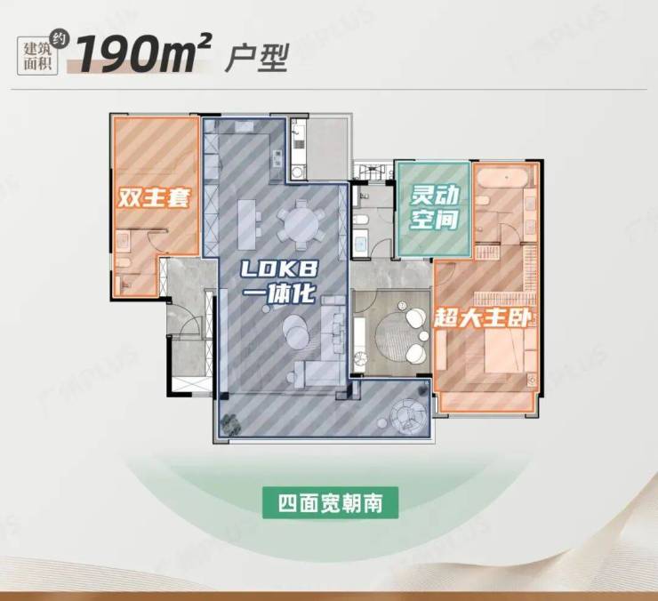 190平方米户型:南北对流双阳台设计,南望2万平方米的花园绿洲,北眺珠江新城CBD,入户玄关和储物间的设计使得空间更加实用。客厅、餐厅、厨房和阳台一体化设计,创造了开放共享的生活空间,增强了家庭成员之间的互动。