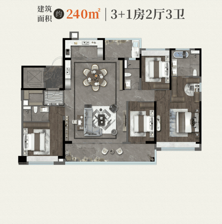 建面约240㎡天际大平层:双面采光的LDKB一体化公区,面积约101㎡,宽敞明亮。长约9.35米的阔景阳台,让阳光与自然景色尽收眼底。双套房设计,为主人和长辈提供舒适的私人空间。