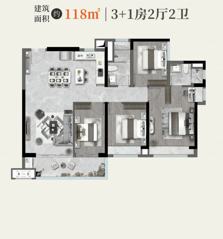建面约118㎡四房两厅两卫:该户型拥有约12.5米的南向采光,约54.6㎡的超级大方厅,长约6米的阔景阳台,通透性极佳。主卧为套房设计,带步入式衣帽间和独立卫浴,配合高尔夫景观,享受加倍。
