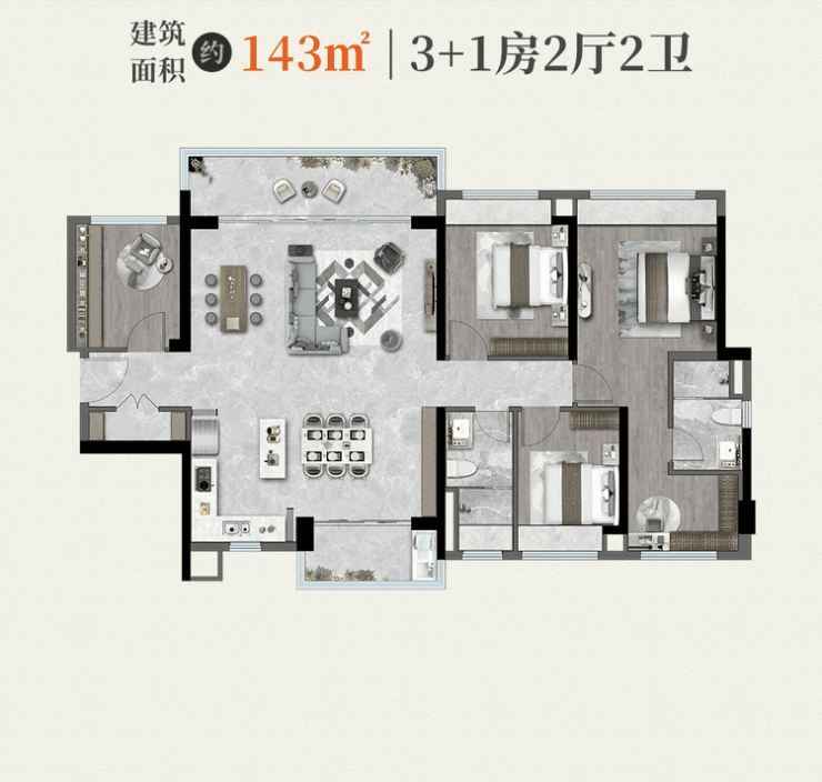建面约143㎡四房两厅两卫:进门右侧是步入式储藏玄关设计,收纳空间翻倍。LDKB一体化公区面积约60㎡,南北对流双阳台配置,是家庭社交的理想场所。主卧整体尺度达约28㎡,带独立衣橱和梳妆台,奢华感十足。