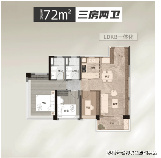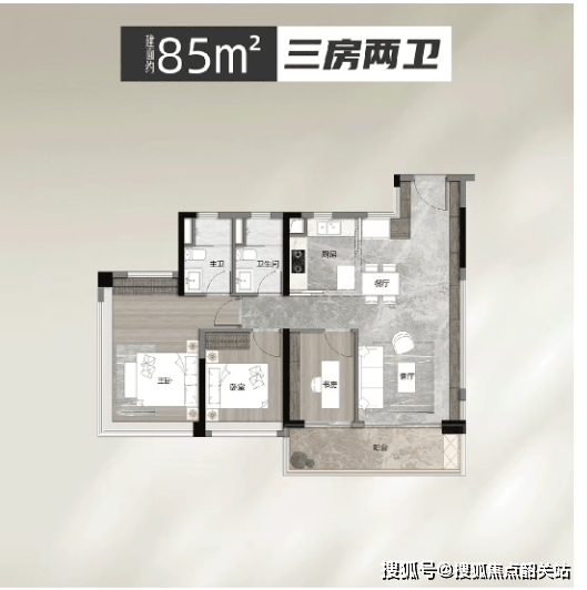 85㎡三房两卫户型,带6米大阳台,空间开阔,利用率高,超越市场同类产品。该户型南北通透,采光通风效果好,6米大阳台连通客厅和卧室,既能莳花弄草、晾晒衣物,又能摆上茶桌观景,实用性和舒适度兼具,适合刚需及刚改群体,既能满足日常居住需求,又能预留一定的活动空间。