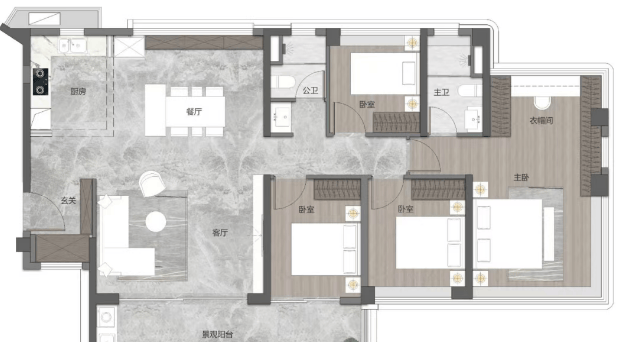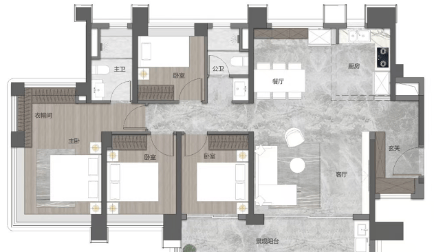 119平方米四房户型:南北通透,灵动宽厅设计,独立入户玄关,步入式套房配置。