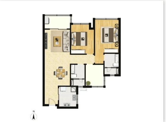 89㎡的2+1房两卫户型:传统经典户型,适合刚需家庭。