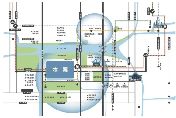 道路网络:“四纵三横”的交通路网使得项目具有较好的出行便利性。“四纵”包括佛山大道、汾江南路、岭南大道、南海大道;“三横”则包括裕和路、荷岳路、乐从大道。