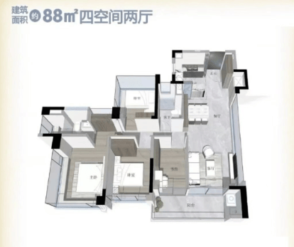 项目推出的88平方米四房两卫和105平方米四房两卫户型,均采用了创新的设计理念,实现了130%的使用率。这些户型不仅满足了不同家庭结构的需求,还通过合理的布局和精巧的设计提升了居住的舒适度和空间利用率。
