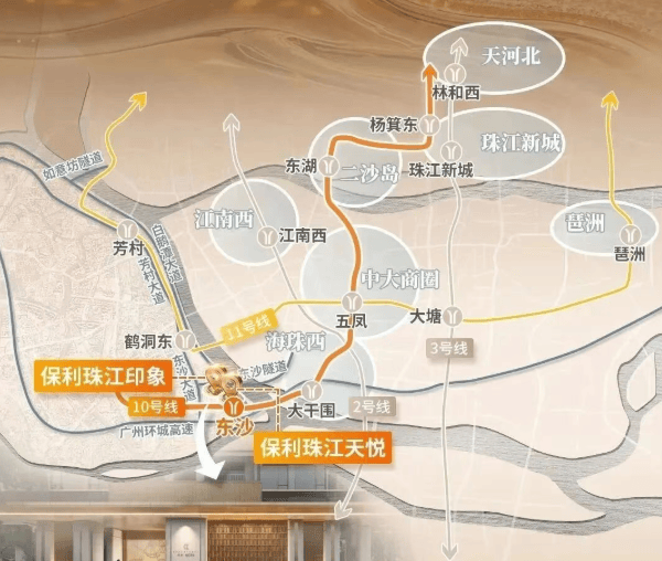 轨道交通方面,项目更是占据了得天独厚的优势。家门口距离地铁10号线东沙站仅700米,步行即可到达。10号线作为贯穿广州中心城区的重要线路,从东沙站出发,仅需4站即可到达中山大学,6站直达滨江东,更可零换乘直通珠江新城这一广州CBD核心。此外,项目周边还汇聚了地铁11号线(环线)和22号线(快线),形成了“三线交汇”的交通枢纽格局。无论您是前往天河上班,还是前往番禺、南沙出差,亦或是周末前往白云山休闲,都能通过便捷的轨道交通网络,实现全城快速通达。
