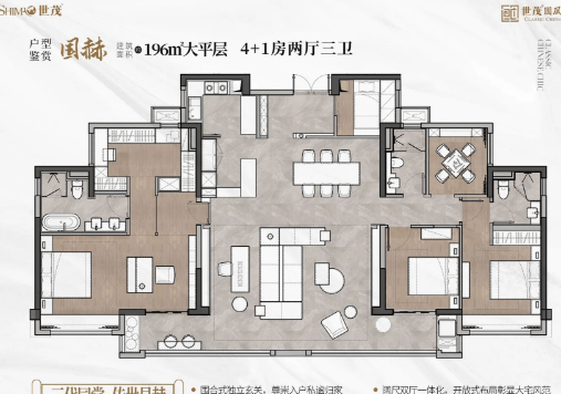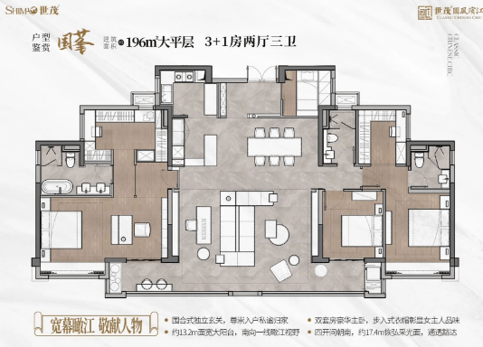 196㎡的大平层户型,是世茂国风滨江的旗舰产品,专为追求极致生活品质的成功人士打造。超大的面宽,带来震撼的视觉效果,南向一线江景一览无余。奢阔的横厅设计,既是家庭活动的中心,也是接待宾客的排面。主卧套房设计,集成了衣帽间、豪华卫生间和观景阳台,宛如五星级酒店总统套房。多个次卧均带有独立卫生间或超大飘窗,保证了每位家人的尊贵体验。中西双厨设计,满足了不同烹饪习惯的需求。这个户型不仅仅是一套房子,更是一种身份的象征,一种对生活艺术的极致追求。